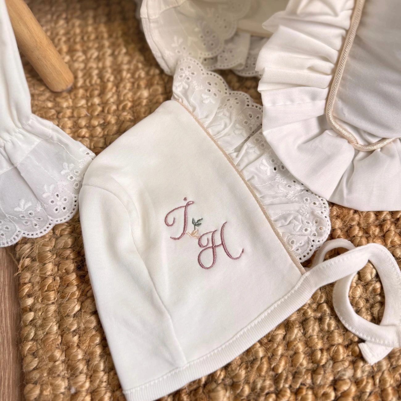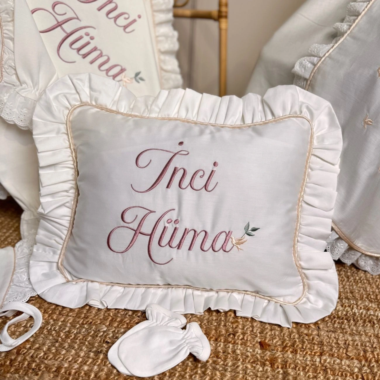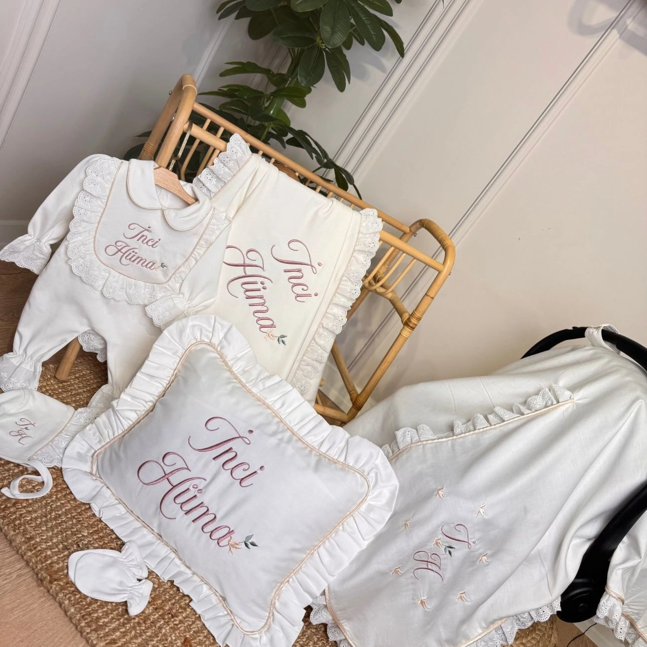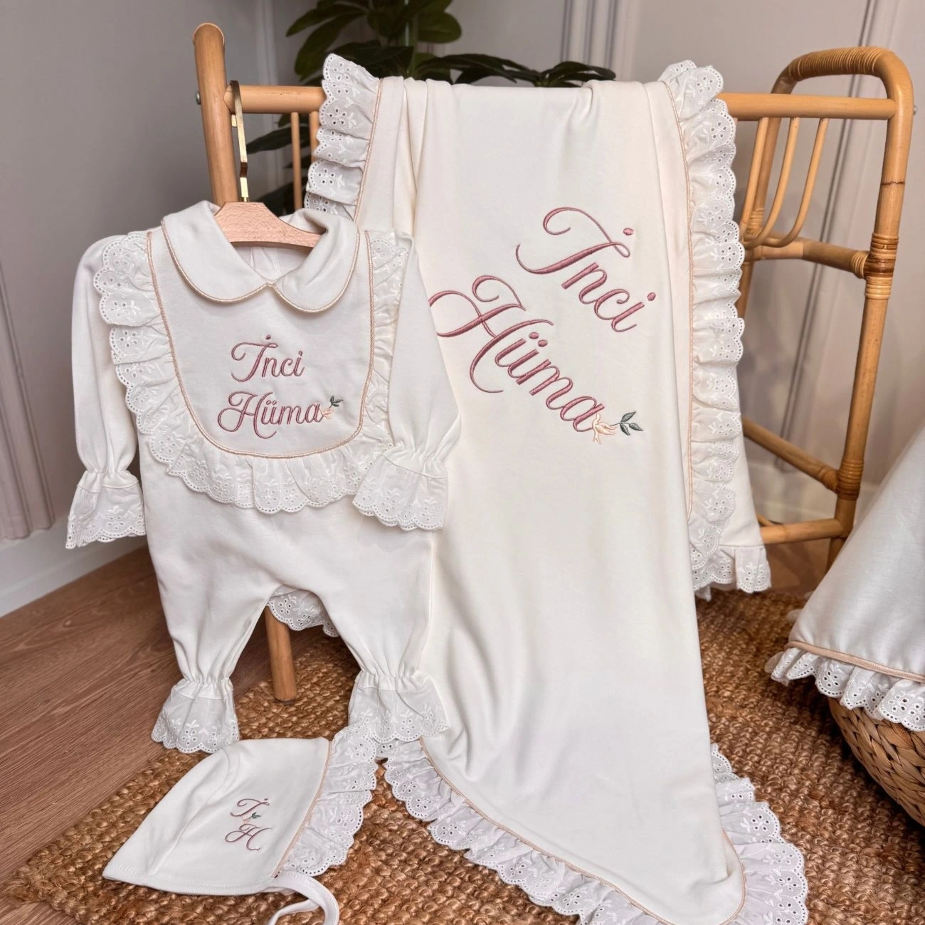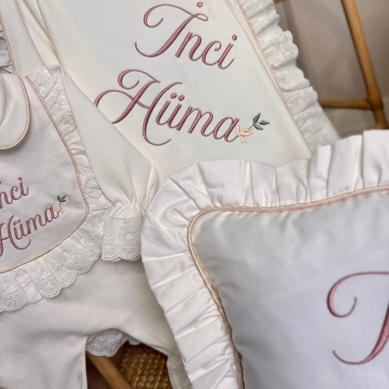 Nakışlar bebeğin adına özel işlenir ve tüm üretim butik işçilikle tamamlanır.